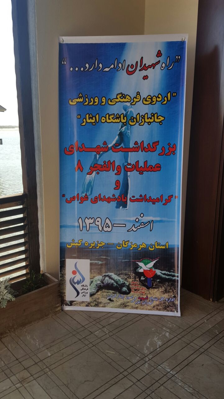 به همت اداره ورزشی اردویی معاونت فرهنگی بنیاد شهید و امور ایثارگران تهران بزرگ و مشارکت باشگاه ایثار وابسته به موسسه فرهنگی ورزشی و توانبخشی ایثار تهران بزرگ، اردوی فرهنگی ورزشی و تفریحی جانبازان ۷۰% باشگاه ایثار از تاریخ ۳۰/۱۱/۹۵ الی ۴/۱۲/۹۵ در جزیره کیش با عنوان ” یادبود شهدای گرانقدر در عملیات والفجر و شهدای غواص و بزرگداشت روز شهید” برگزار گردید.