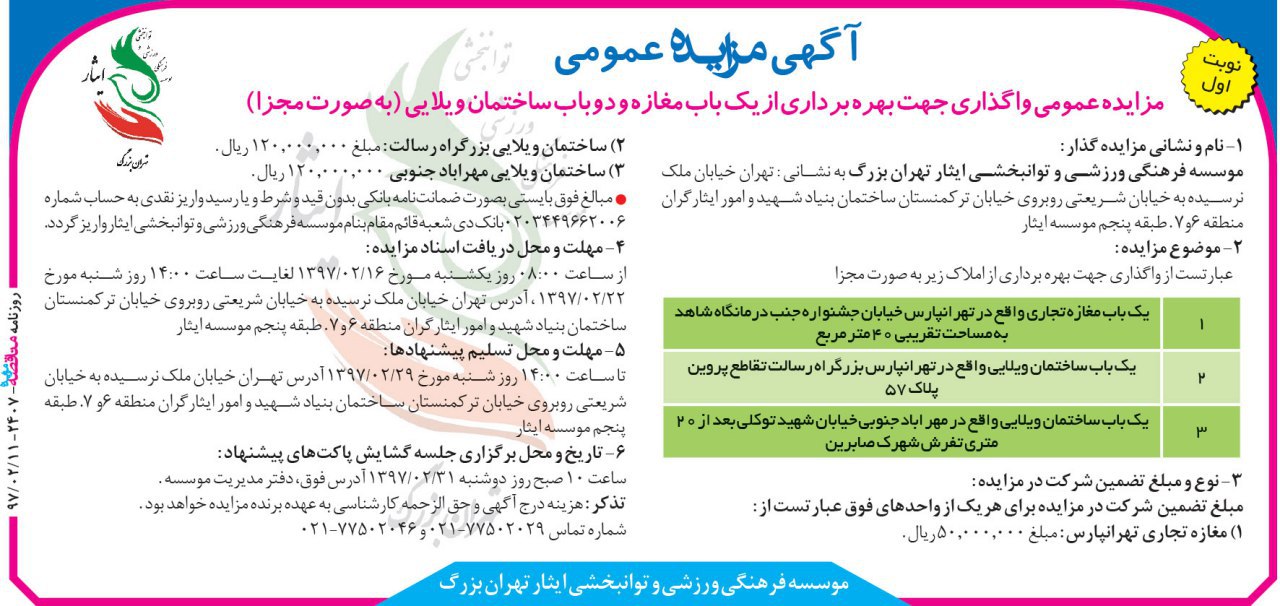 ۱) نام و نشانی مزایده گذار : موسسه فرهنگی ورزشی و توانبخشی ایثار تهران بزرگ به نشانی : تهران خیابان ملک نرسیده به خیابان شریعتی روبروی خیابان ترکمنستان ساختمان بنیاد شهید و امور ایثارگران . طبقه پنجم موسسه ایثار ۲) موضوع مزایده : عبارتست از واگذاری جهت بهره برداری از املاک زیر به صورت مجزا […]