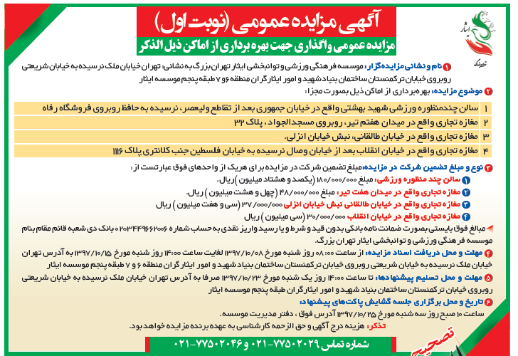 راس ساعت ۱۰ صبح روز سه شنبه مورخ ۹۷/۱۰/۱۱ جلسه بازگشایی پاکات مزایده عمومی بهره برداری از اماکن مجتمع سیدالشهداء (ع) شهرک فجر این موسسه با حضور آقایان افراسیابی(رئیس اداره حراست بنیاد شهید تهران بزرگ)، میرزا(مدیرکل حراست موسسه ایثار)، شجردی (مدیر حقوقی موسسه ایثار) ، شه روش(مدیر موسسه ایثار تهران بزرگ) در دفتر موسسه ایثار […]